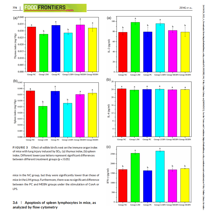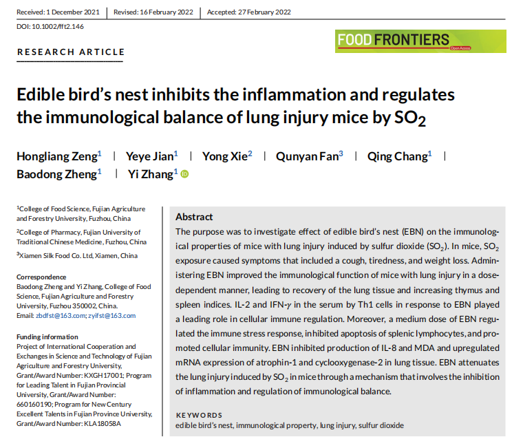 近日,燕之屋聯(lián)合福建農(nóng)林大學(xué)在《Food Frontiers》(國際權(quán)威ESCI期刊)發(fā)表論文“Edible bird's nest inhibits the inflammation and regulates the immunological balance of lung injury mice by SO2 ”,揭示燕窩具有保護(hù)肺部的功效。