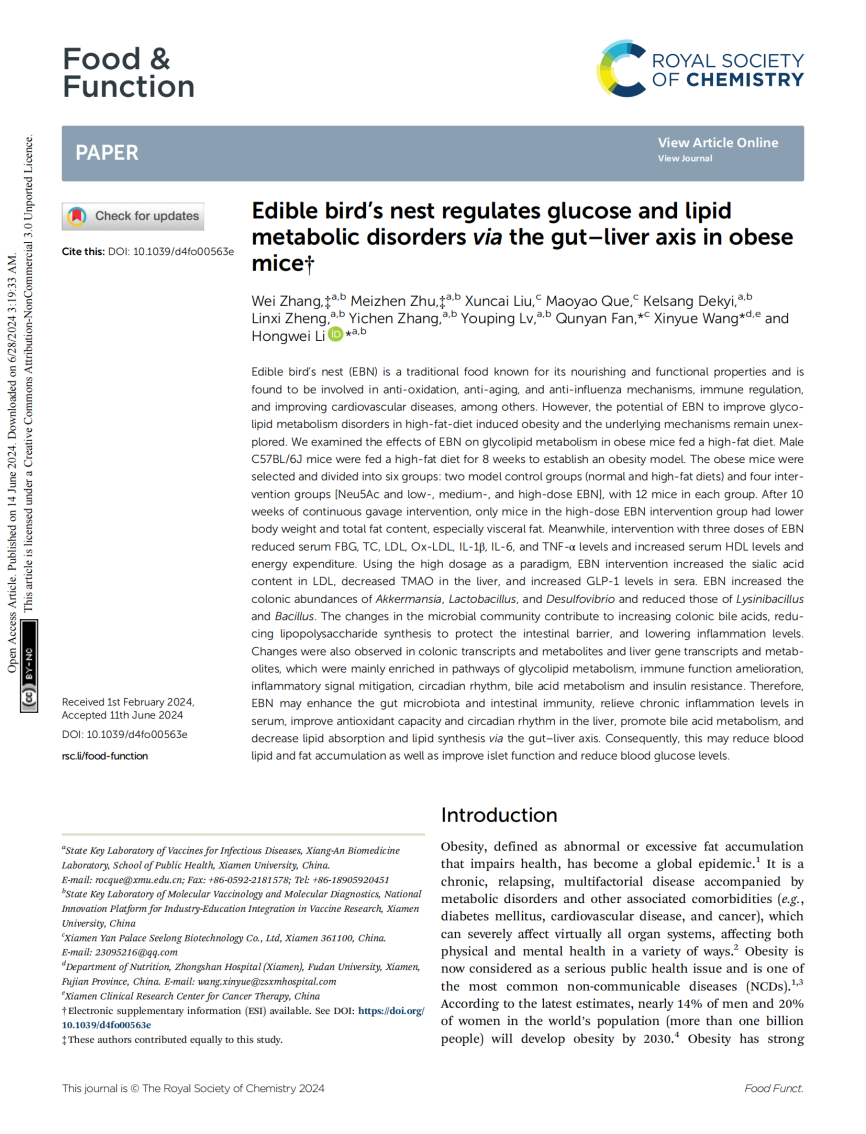 ④Edible bird's nest regulates glucose and lipid metabolic disorders via the gut–liver axis in obese mice[J]. Food & Function, 2024, 15(14): 7577-7591.