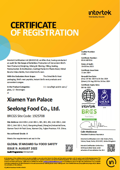 圖:燕之屋獲得BRC食品安全全球標(biāo)準(zhǔn)、IFS國(guó)際食品標(biāo)準(zhǔn)認(rèn)證